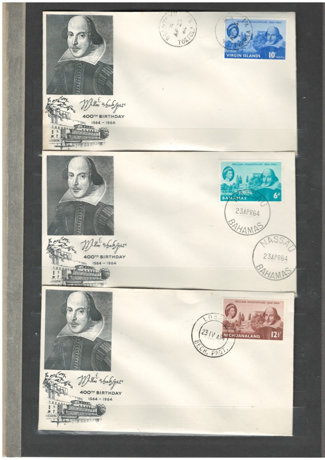 VIRGIN ISLANDS,​ BECHUANALAND,​ BAHAMAS QEII SHAKESPEARE FDC COVERS LOT (BCL 357)